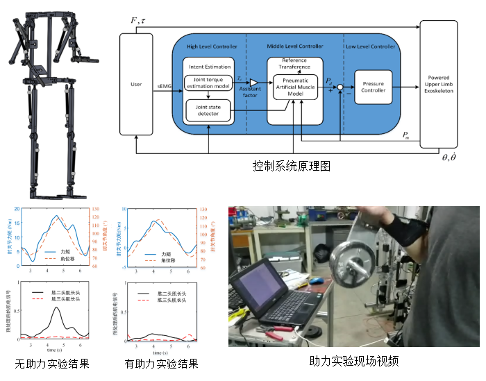 项目研发了基于气动肌肉驱动的外骨骼助力机器人机构,研究了人机协同控制理论及运动控制方案。