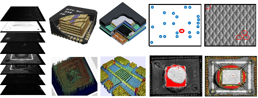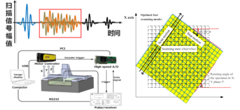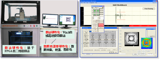 超声显微系统是采用高频率超声信号来对微纳器件进行高分辨率成像检测,主要由GHz信号高速采集卡、亚微米级精密扫描机构、百兆级带宽的相控阵超声发射接收器和高速图像处理板卡及高频探头等组成。本项目实现了微纳器件的高效率、高精度三维成像和检测:包括快速扫描模式、自回归反卷积、多层同时扫描、智能识别等关键技术。