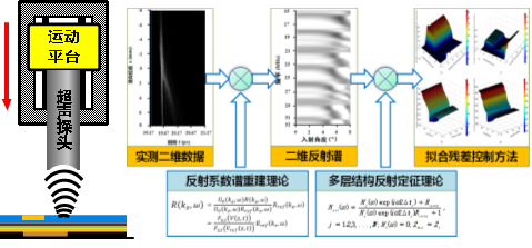 获取薄层材料对聚焦声场不同位置的回波信号,利用二维时空变换方法产生多频率、多角度反射系数谱,建立多层反射系数谱定征理论,通过多参数拟合残差控制方法控制材料特性参数的拟合求解精度,从而实现对薄层材料厚度、密度、声速、声衰减和杨氏模量的无损精确测量。