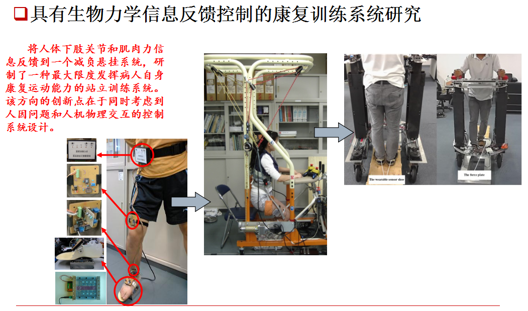 将人体下肢关节和肌肉力信息反馈到一个减负悬挂系统,研制了一种最大限度发挥病人自身康复运动能力的站立训练系统。该方向的创新点在于同时考虑到人因问题和人机物理交互的控制系统设计。