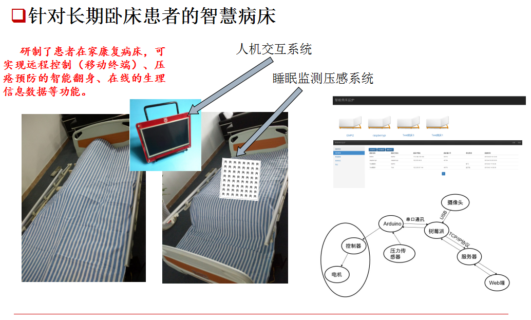 研制了患者在家康复病床,可实现远程控制(移动终端)、压疮预防的智能翻身、在线的生理信息数据等功能。
