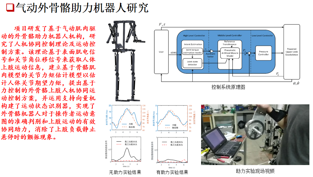 项目研发了基于气动肌肉驱动的外骨骼助力机器人机构,研究了人机协同控制理论及运动控制方案。该理论基于表面肌电信号和关节角位移信号来获取人体上肢运动信息,建立基于骨骼肌肉模型的关节力矩估计模型以估计人体关节期望力矩,提出基于力控制的外骨骼上肢人机协同运动控制方案,并运用支持向量机构建了运动状态识别器,实现了外骨骼机器人对于操作者运动意图的准确判别和上肢运动的有效协同助力,消除了上肢负载静止悬停时的颤振现象。
